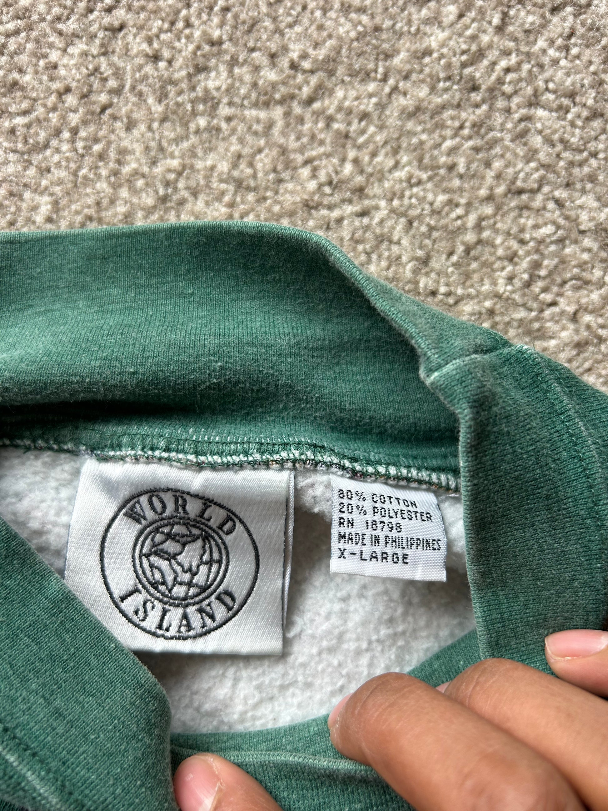 a dark green base with a multicolored Aztec and geometric pattern, characteristic of 1980s and 90s knitwear designs. XL